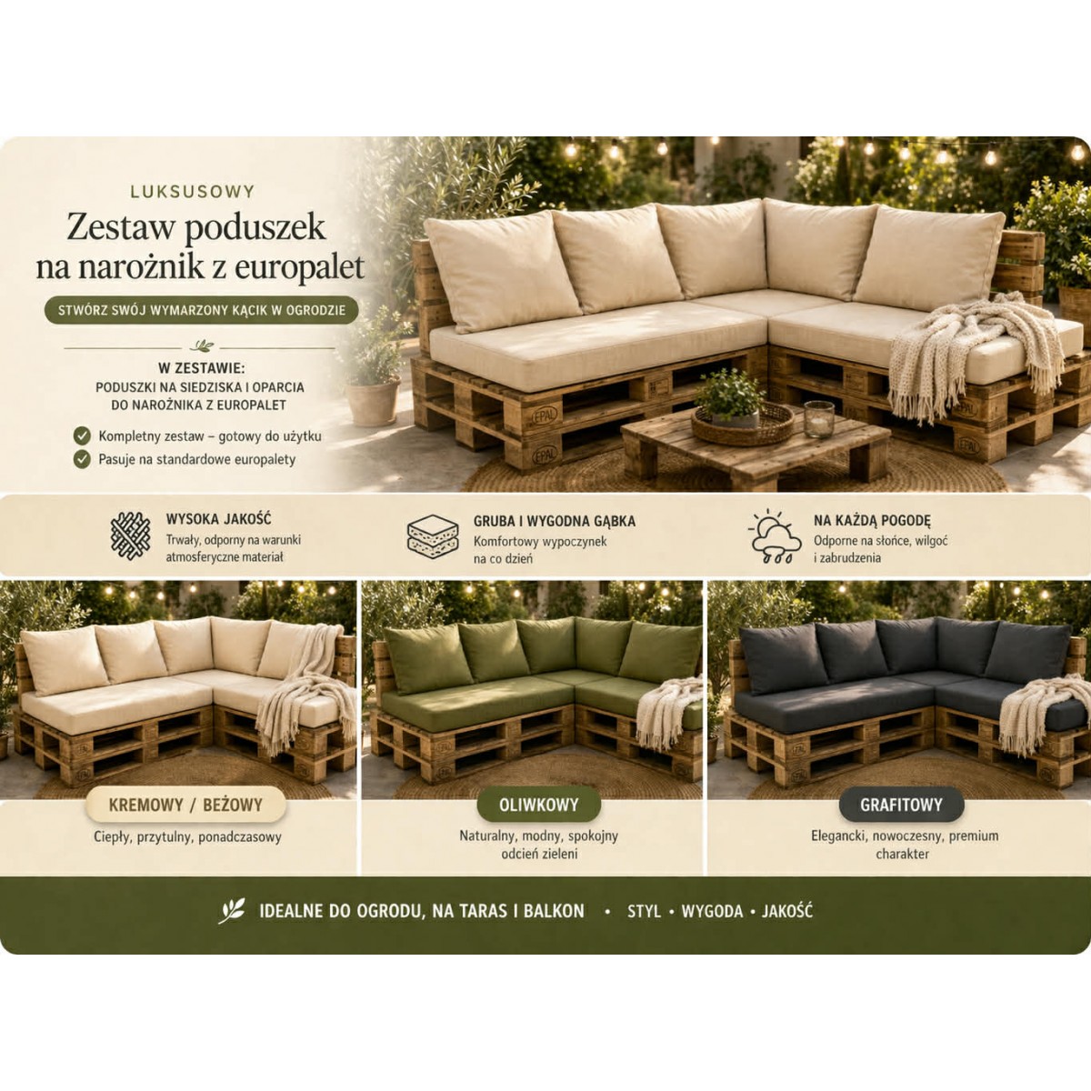 Stwórz wyjątkową przestrzeń do relaksu dzięki zestawowi poduszek idealnie dopasowanych do mebli z europalet. To połączenie wygody, trwałości i nowoczesnego designu, które odmieni każdy taras, balkon czy ogród.